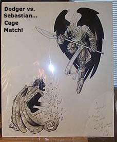artwork from Phil Foglio, then wandered by Ruth Thompson's art booth and saw this gorgeous archangel picture. Was going to just buy the one, matted, but then I saw the other two (Gabriel, Michael, and Azrael) and ended up buying all three, framed. Ruth promised to wrap them up for us and keep them so we could pick 'em up on Sunday.