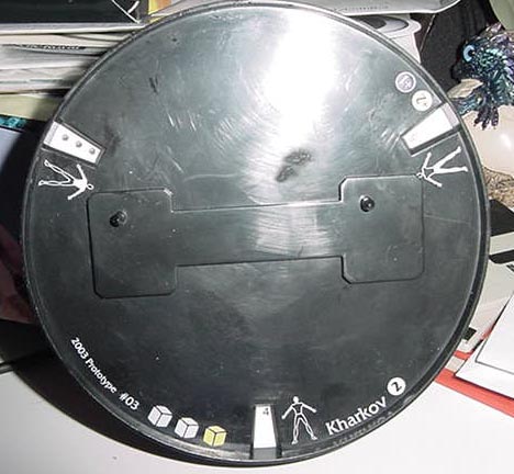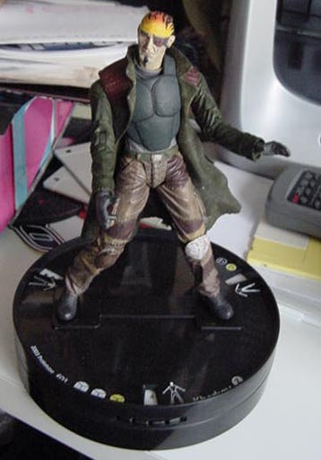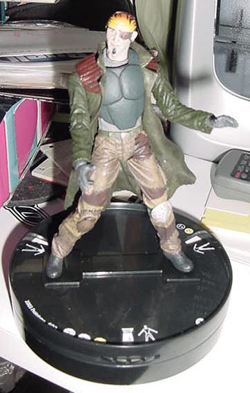 The base comes in two pieces as you can see in the pics. The top piece contains three independently movable clicky-gauges, one each for head (initiative and movement), upper body (weapon/attack value), and lower body (body/defense value). In the middle of this piece are two posts to accept the holes in the bottom of the figure's feet.