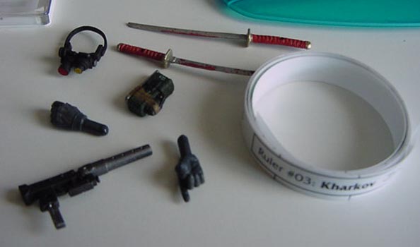 He's delivered with the following accessories: Two removable "game hands" with posts, a katana, a wakazashi, an SMG, a pair of goggles, and an unidentified piece that looks like a walkie-talkie with a grenade taped to it. Each piece has a number and a dice marking on it to indicate how many slots it takes and how much damage it does. He also comes with a tape ruler indicating the distances for his attacks (see below). Rulers have "damage tracks" that indicate attack ranges. Green is Long range, Blue is Short, Yellow is Close, Black is Tech, and Red is Magic. (Not everybody has Tech and Magic, obviously. Kharkov doesn't.)